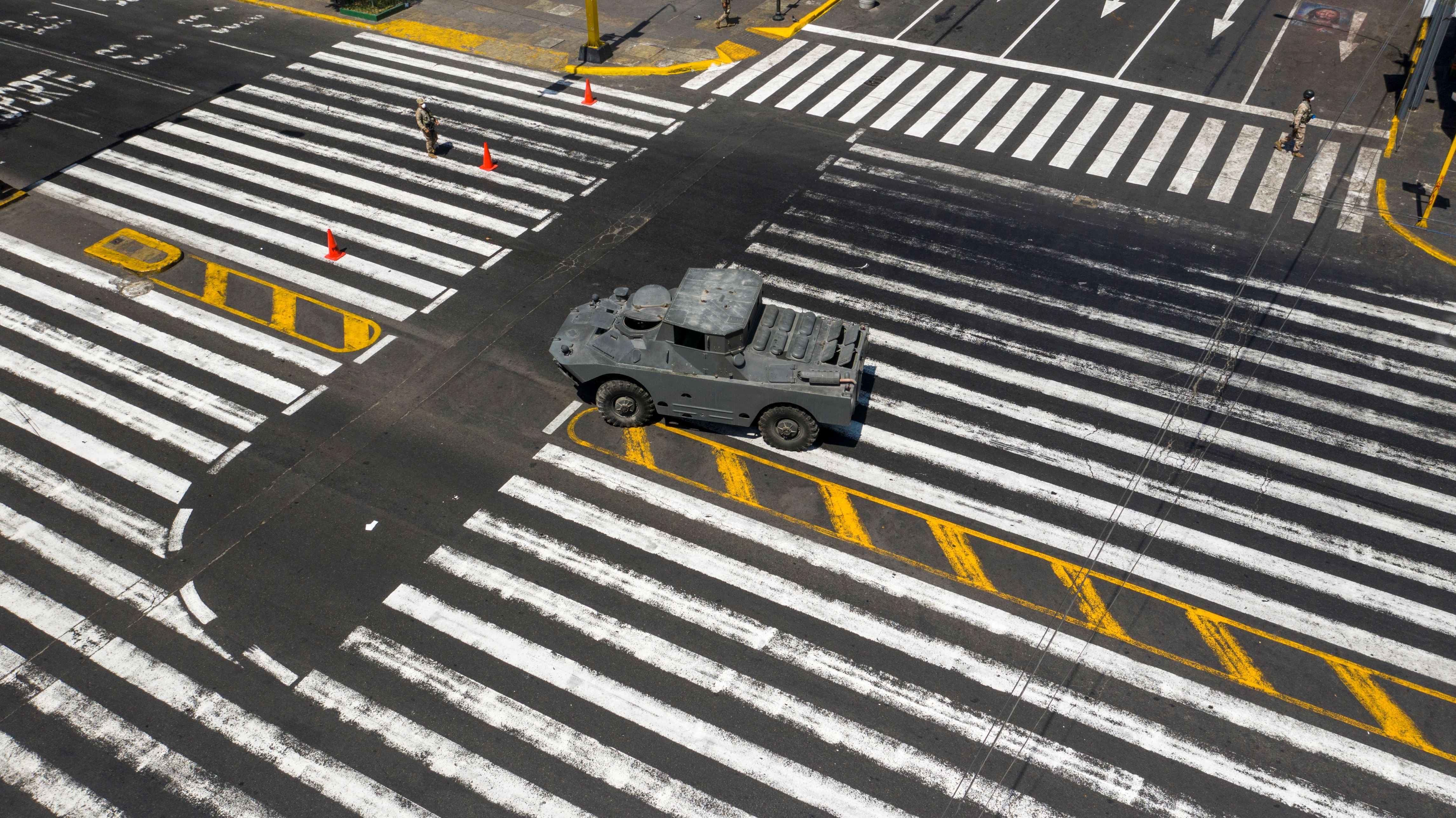 Un vehículo militar cruza la intersección en la avenida Abancay en la capital peruana, luego de que el gobierno de Martín Vizcarra implementó restricciones al libre tránsito para contener la propagación del virus. En el Cono Sur, el gobierno de Chile también desplegó militares en las calles para restringir las actividades sociales a través de la declaración de Estado de Catástrofe.