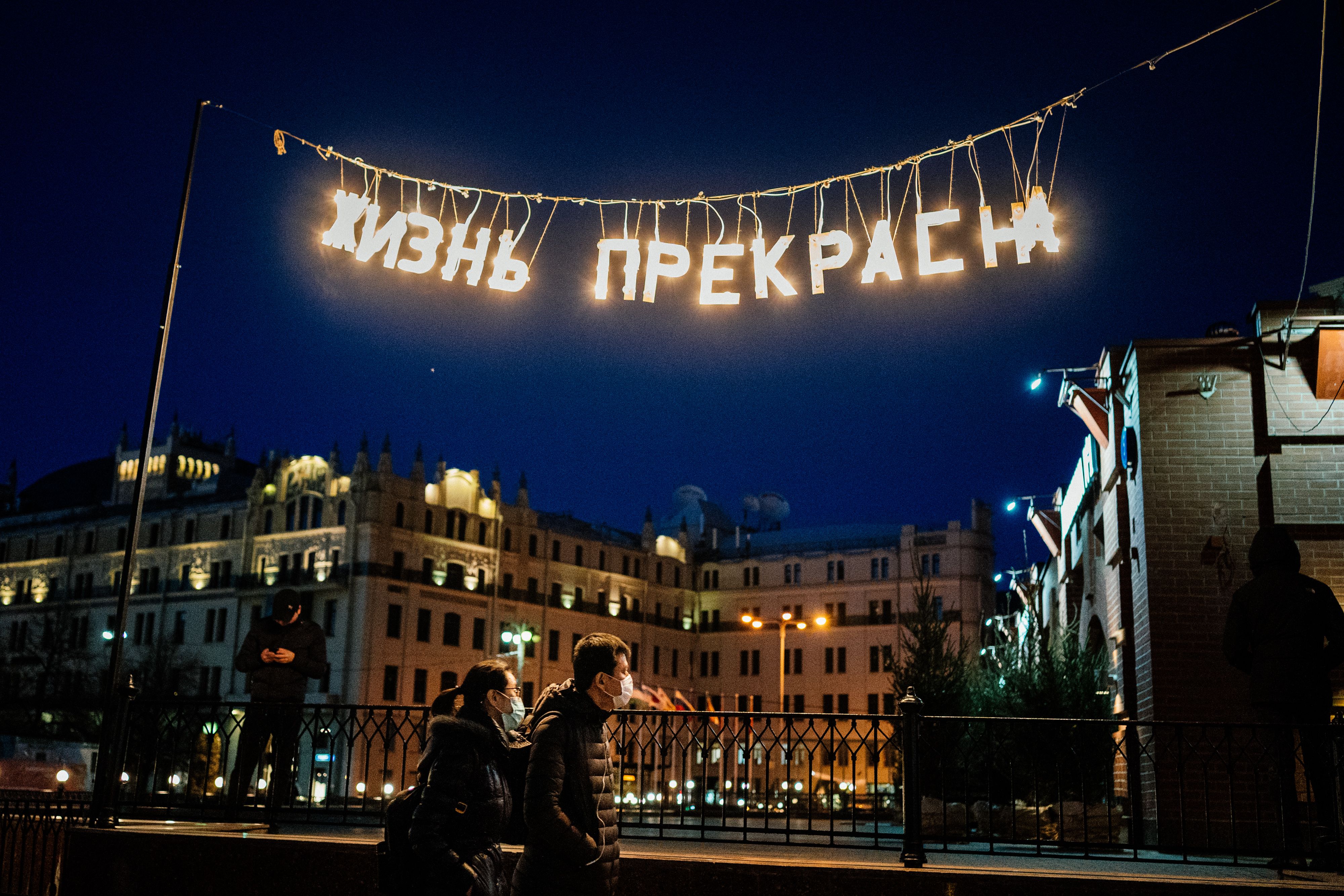 Dos personas con mascaras protectoras caminan debajo de un letrero en ruso que que se traduce como «la vida es maravillosa», en el centro de Moscú. Debido a que el gobierno de Vladimir Putin cerró fronteras poco después de comenzada la crisis en Wuhan, se han registrado menos de 200 casos en todo su territorio y hasta este 19 de marzo no había víctimas fatales. La primera persona fallecida fue una mujer de 79 con varias enfermedades preexistentes.